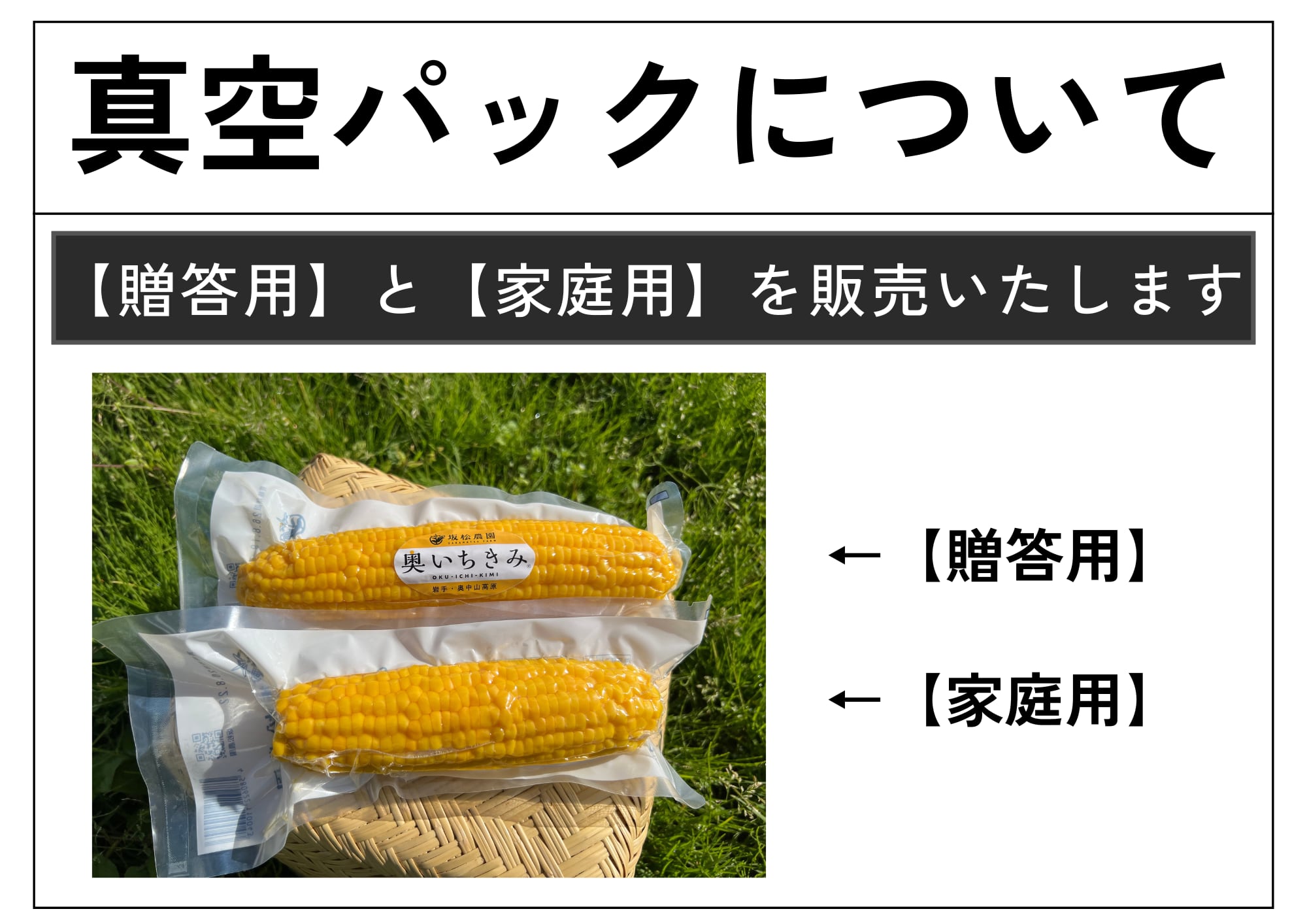 【必ずお読みください】 ◎贈答用に選別されなかった美味しい奥いちきみ真空パックを限定で【家庭用】として販売いたします。 【家庭用】 ・奥いちきみのシールがありません。 ・味は変わりありません。 ◎配送日の指定は出来ませんので、ご了承ください。 発送確定後、宅急便追跡番号が記載された発送メールが送信されます。 ◎クレジットカード決済のみとさせて頂きます。 【商品について】 「奥いちきみ真空パック」の【家庭用】をご用意いたしました。 朝採れのみを加工しております。 封を開けた瞬間の香り、甘さと食感が楽しめます。 輪切り、天ぷら、とうもろこしご飯など調理してもお楽しみいただけます。 「奥いちきみ」は、 「一本の幹から一番甘い一個だけを収穫」にこだわったスイートコーン。 坂松農園オリジナルブランドです。 【家庭用】奥いちきみ真空パック【25本入り】 【品 種】恵味ゴールド 【賞味期限】2026年7月 開封後はお早めにお召し上がりください。 【宅配サイズ】100サイズ 【配送会社】ヤマト運輸 【送 料】地域別に設定しております。 詳しくは、送料詳細をご覧ください。